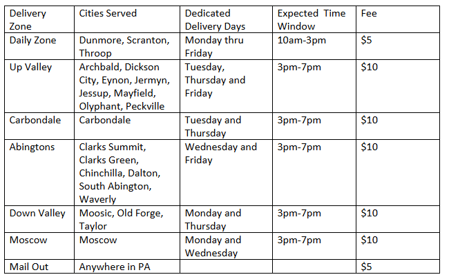 Some of the places we deliver to: Dunmore, Scranton, Dickson City, Throop, Olyphant, Archbald, Jessup, Jermyn, Carbondale, Clarks Summit, Taylor, Old Forge, Moosic and Moscow.